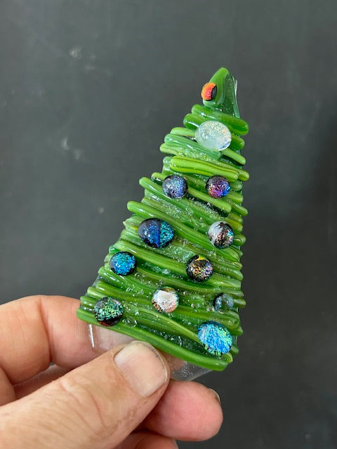 Go bright green with these 10cm tall trees with dichroic glass decorations, set in a rimu stand.